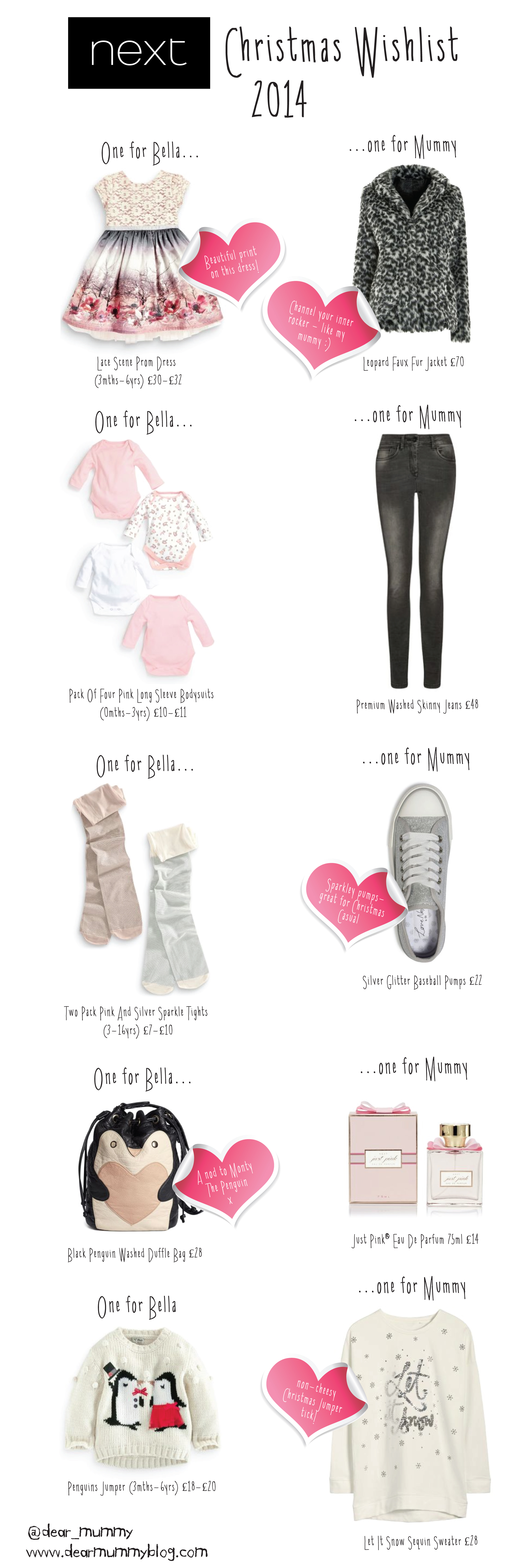 Dear Mummy, it’s that time of year, when people crack open the ‘Christmas Jumpers’ and the glitzy party wear. We’ve scoured the high street shops and are quite excited about the NEXT collection in stores and online. Some really nice stuff there. Here’s our Christmas Wish List. My mummy’s favourite item from their collection is the funky (and warm) Leopard Faux Fur Jacket at £70. Mine is the super stylish Lace Prom Dress at around £30. We’ve teamed them below with our favourite pieces from NEXT stores. What would be on your NEXT Wish List?