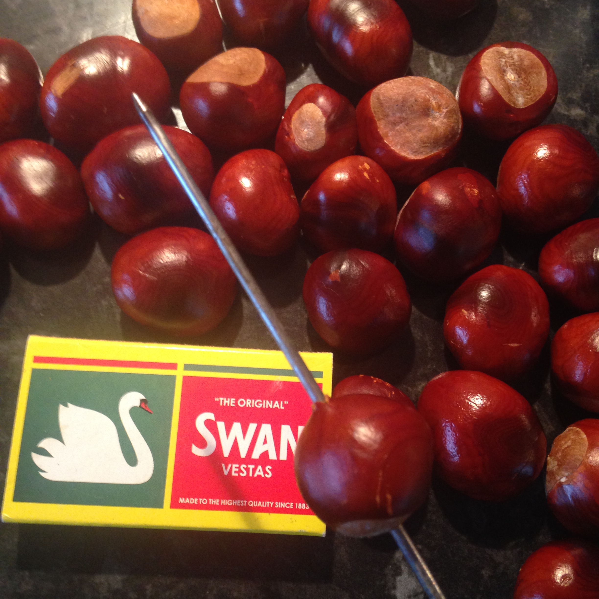 We had fun making ‘Conker Monsters’ out of the ones we collected and my mummy spent some time piercing their shells with a hot metal skewer which she heated up with a lighter and matches. The are actually easier to make a hole in than you think – it’s the threading which is tricky!!