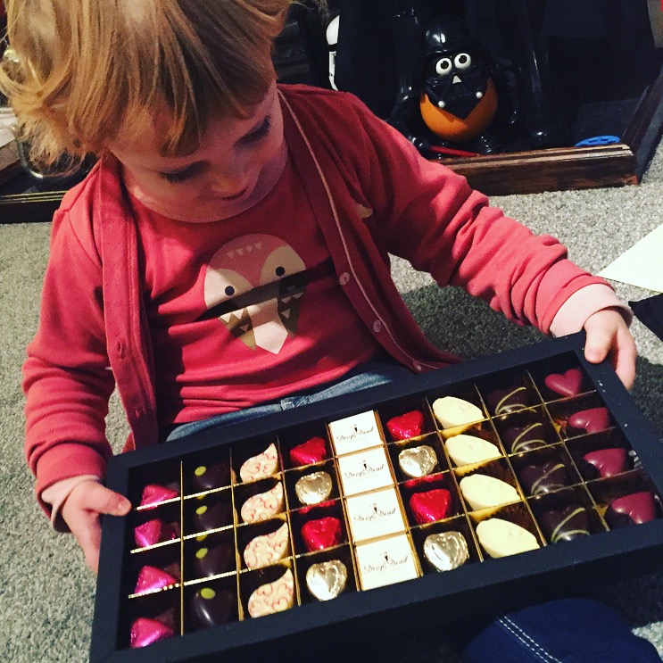I try one of the simple pralines, and have fun ripping it from the foil wrapper. I lick out the centre and hand it back to my mummy, chocolate all around my face. I think that was a success then?